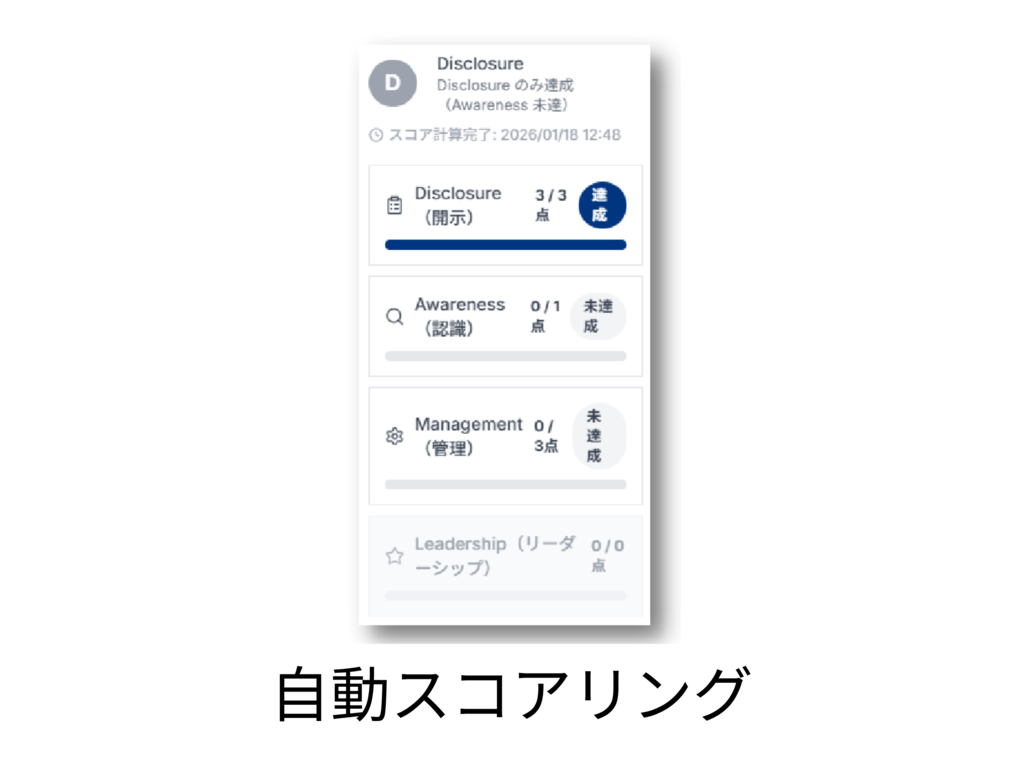 CDPのメソドロジー・スコアリング基準・業種別ウェイトを学習したAIが、入力した回答内容をリアルタイムで採点。設問ごとのDisclosure / Awareness / Management / Leadershipレベルでの得点予測と、オーバーオールのスコアレンジ(A~D-)を提示します。「どこで失点しているか」が一目で分かるため、コンサルティングなしでも重点的な改善が可能です。