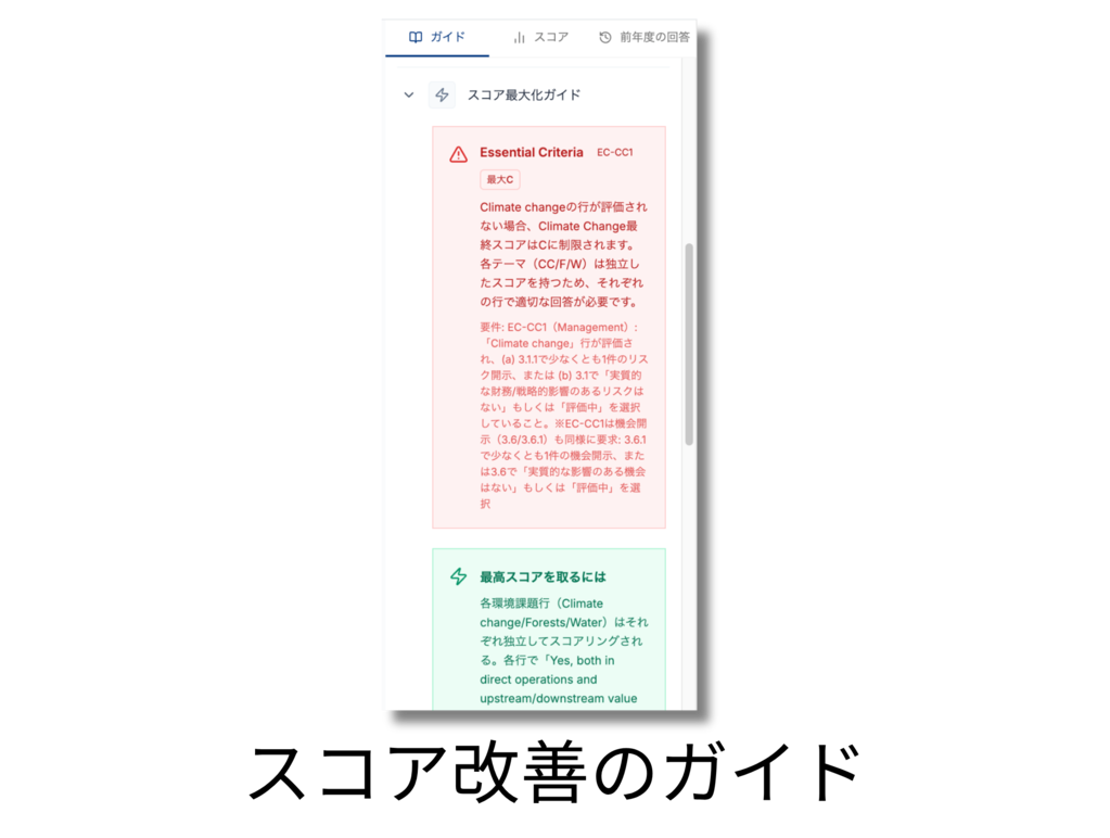 エッセンシャルクライテリア(必須要件)に基づく自動採点が可能です。自社のドラフト回答とCDP要求との差異を入力と同時に判断するため、スコアの頭打ちを未然に防止します。