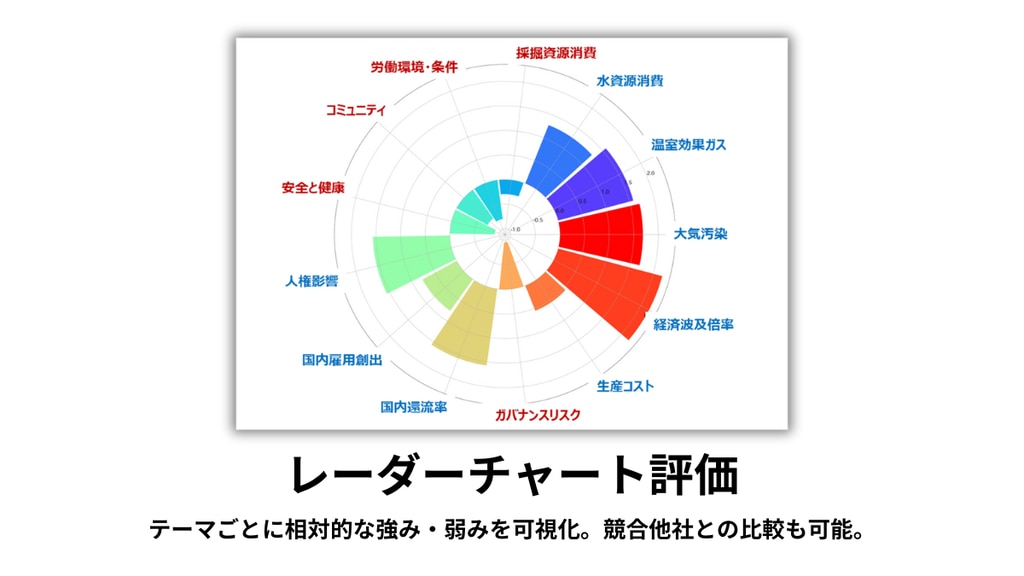 温室効果ガス、人権、労働環境、水資源、コミュニティなど、様々なESG指標で多角的に評価。レーダーチャートによる視覚的な強み・弱み分析に加え、競合企業ランキングの作成や、評価の根拠となった記述のハイライト表示することにより、透明性の高い分析を実現。