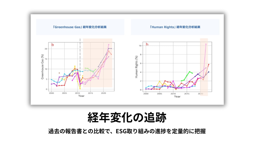 はい、経年変化分析が可能です。過去3〜5年分の報告書をご提供いただければ、ESG取り組みの進捗やトレンドを可視化いたします。
